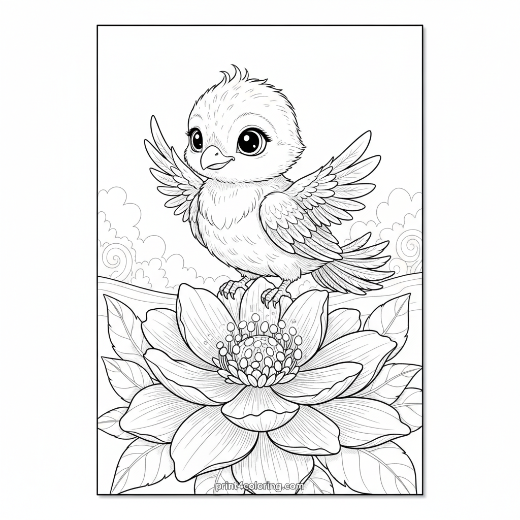 Imagine a magical moment! A precious baby phoenix, with soft, downy feathers and curious eyes, gently rests on a magnificent flower. This special blossom softly glows with warm, ember-like light, highlighting the phoenix's tiny, unfurling wing feathers. A truly enchanting scene waiting for your colors!