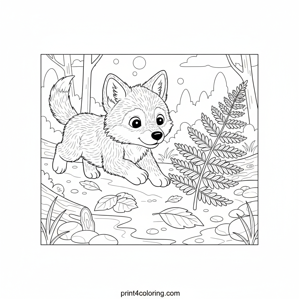 Fluffy Paws, Fern Fronds: A Wolf Pup's Forest Frolic Coloring Page