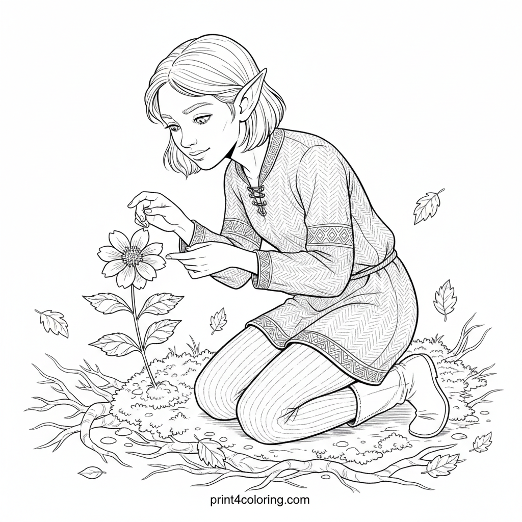 Step into an enchanted forest scene where a kind young elf kneels, captivated by a tiny, delicate wildflower. Explore the intricate details of the elf's clothing, the flower's delicate petals, and the mossy forest floor with roots and fallen leaves. A truly magical moment waiting for your colors!