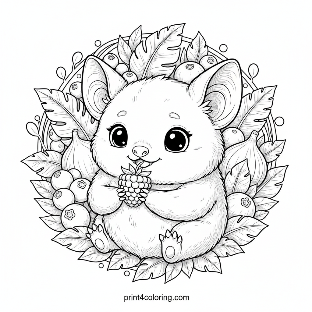 Dive into a delightful scene where a fluffy, big-eyed fruit bat enjoys a delicious berry feast! Surrounded by lush leaves and a bounty of ripe fruits in a magical botanical garden, this cozy creature invites you to bring its world to life with vibrant colors. A sweet adventure awaits!