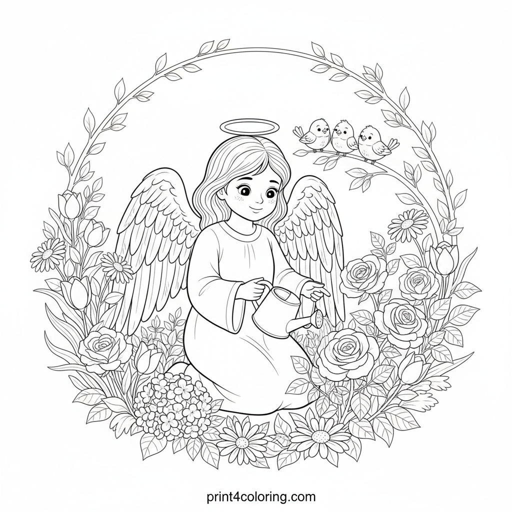 Step into a serene garden where a kind-faced guardian angel, with magnificent feathery wings, gently waters a blooming rose bush. Small, friendly birds perch nearby, adding to the peaceful charm. This detailed scene offers expert colorists a delightful challenge to bring lush foliage and delicate features to vibrant life.