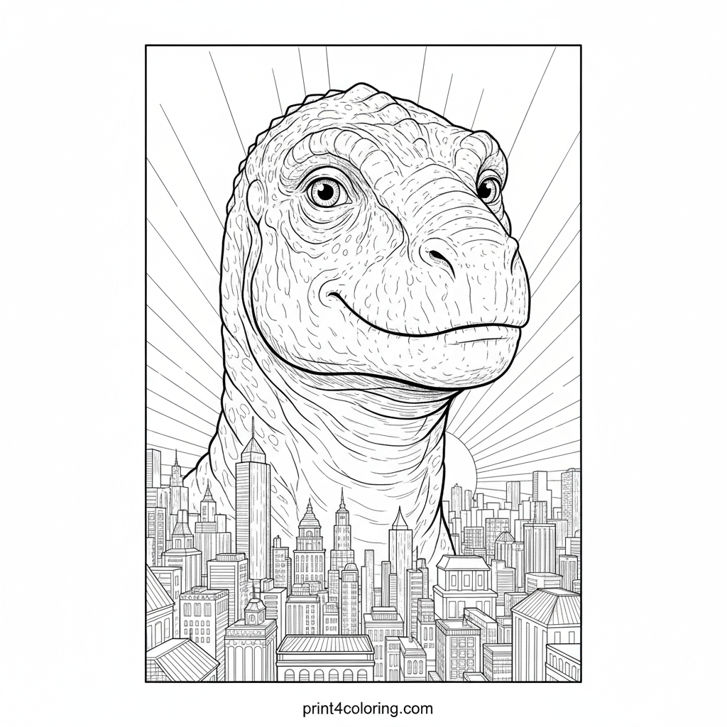 Imagine a colossal, friendly creature with a kind face, watching over a sleeping city as the sun begins to rise. Its gentle gaze takes in the intricate rooftops and towering buildings, outlined against a beautiful, soft morning sky. A perfect scene for detailed coloring.
