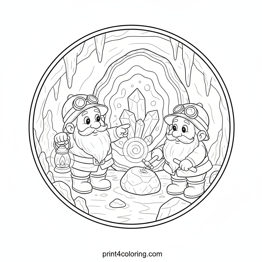 Geode Glimmer: Dwarf Explorers' Underground Find Coloring Page