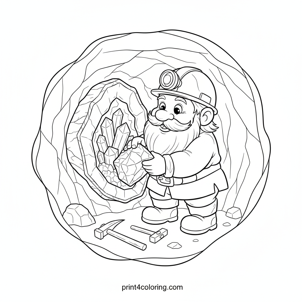 Join a cheerful gnome deep inside a mystical cave as he uncovers a breathtaking geode! Watch as sparkling crystals are revealed, surrounded by his trusty mining tools. This intricate scene invites you to add vibrant colors to the gnome's cozy attire, the rugged cave, and the dazzling gems he's found.