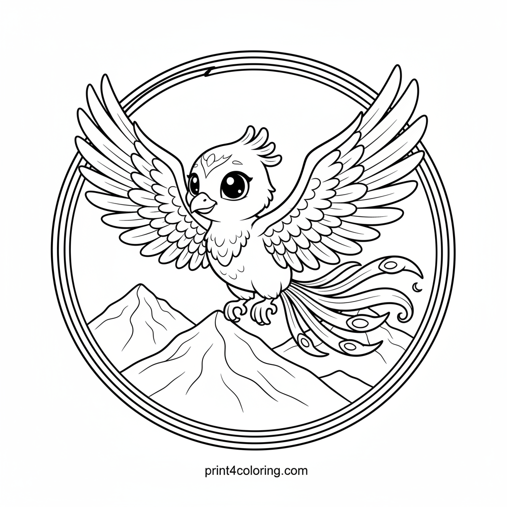 Watch a magnificent phoenix with beautifully detailed wings soar high above rugged, ancient mountain peaks. Feel the magic as each feather catches the invisible breeze, creating a breathtaking and cozy scene ready for your vibrant colors. A mythical adventure awaits!