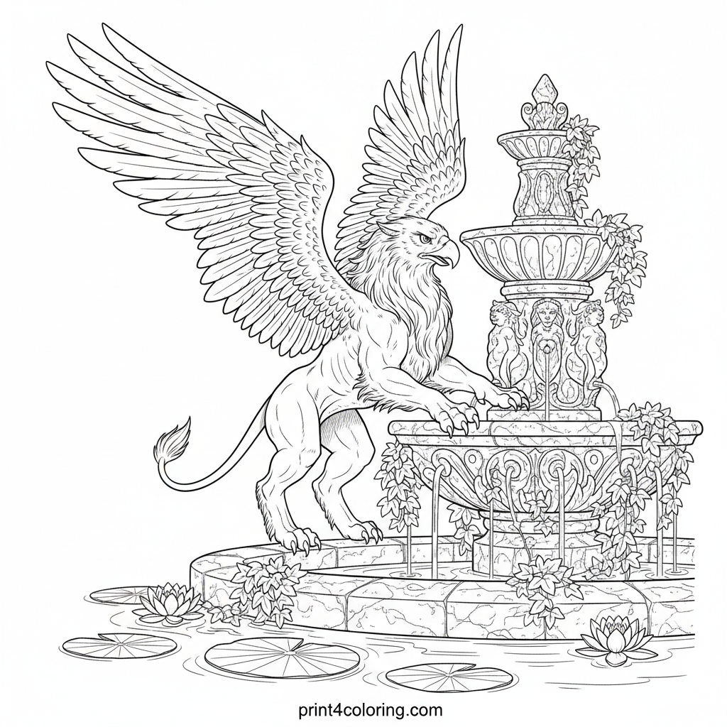 Imagine a majestic griffin taking a peaceful break by an ancient, beautifully carved stone fountain. Delicate ivy climbs the weathered stone, and water lilies float gently in the basin, creating a magical and tranquil scene for you to bring to life with color.
