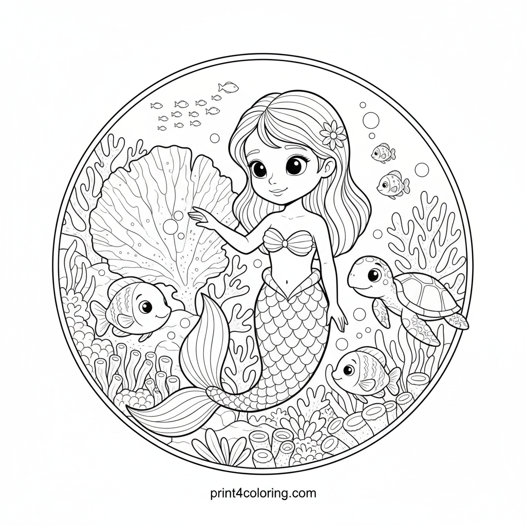 Explore an enchanting underwater world with a sweet young mermaid! She gently touches a vibrant coral fan, surrounded by playful fish and a friendly sea turtle. This detailed scene invites you to bring the colorful coral, graceful anemones, and schooling fish to life, creating a cozy ocean masterpiece.