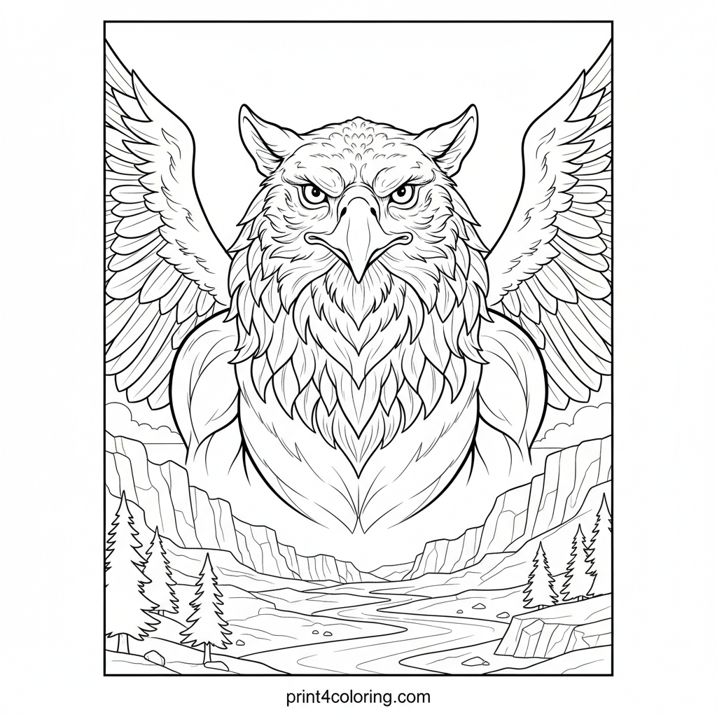 Soar through the skies with this magnificent griffin, wings spread wide as it glides over a breathtaking canyon. Every feather and muscle is finely detailed, inviting you to bring this powerful mythical creature and its dramatic surroundings to life with your colors. Explore the rugged rock formations, distant pine trees, and winding river below.