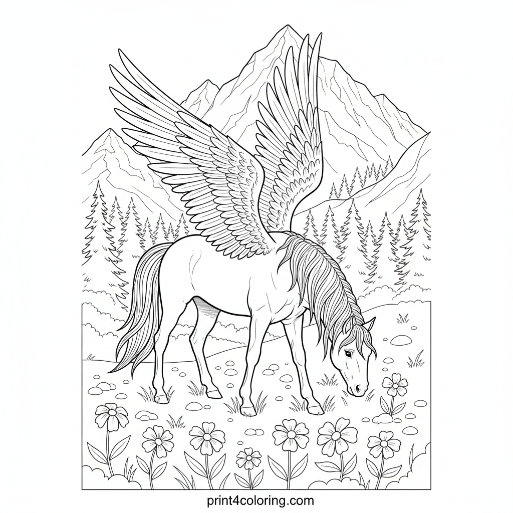Majestic Pegasus in Alpine Meadow Coloring Page