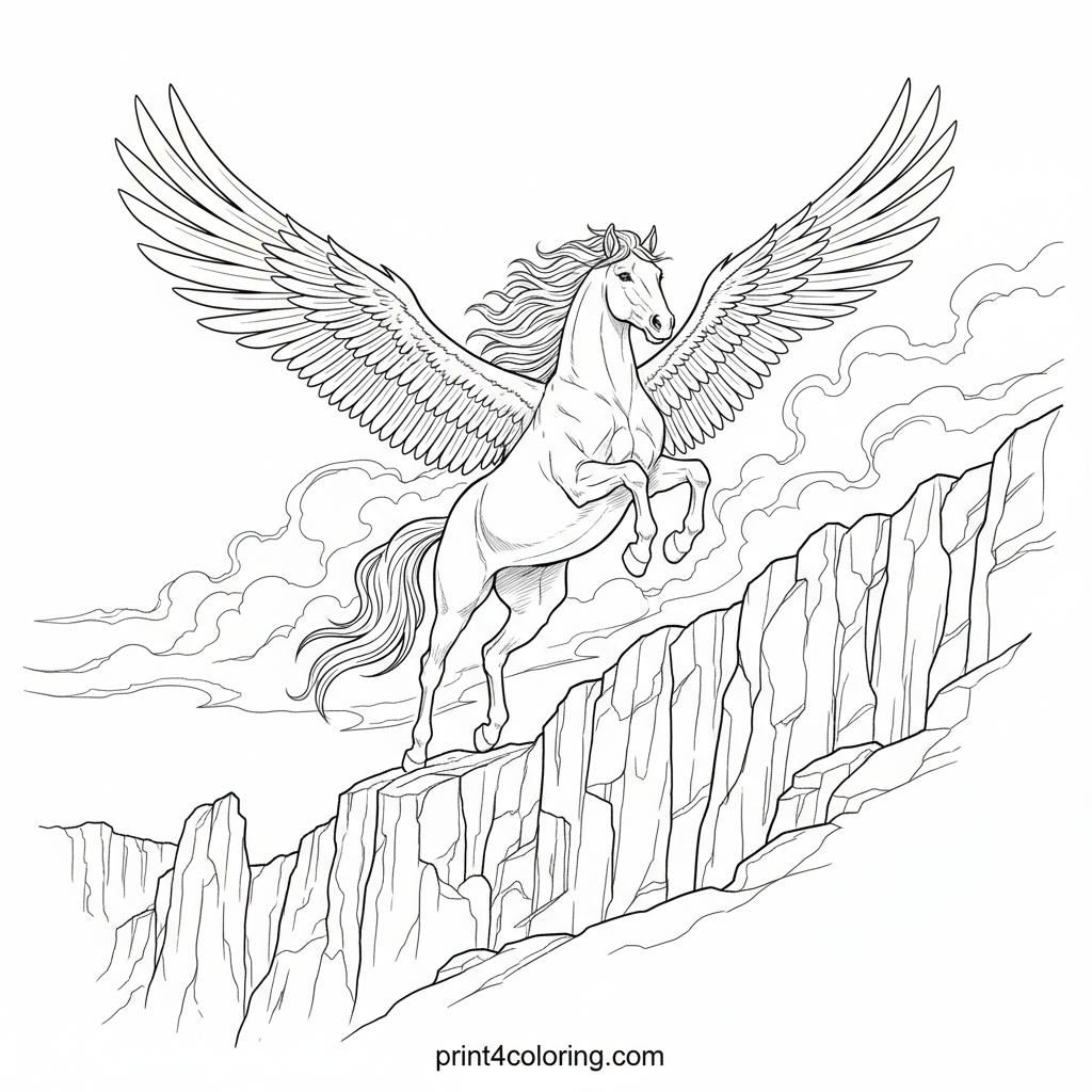 #pegasus#mythical-creature#flying-horse#cliffs#action#fantasy#epic#coloring-page#printable