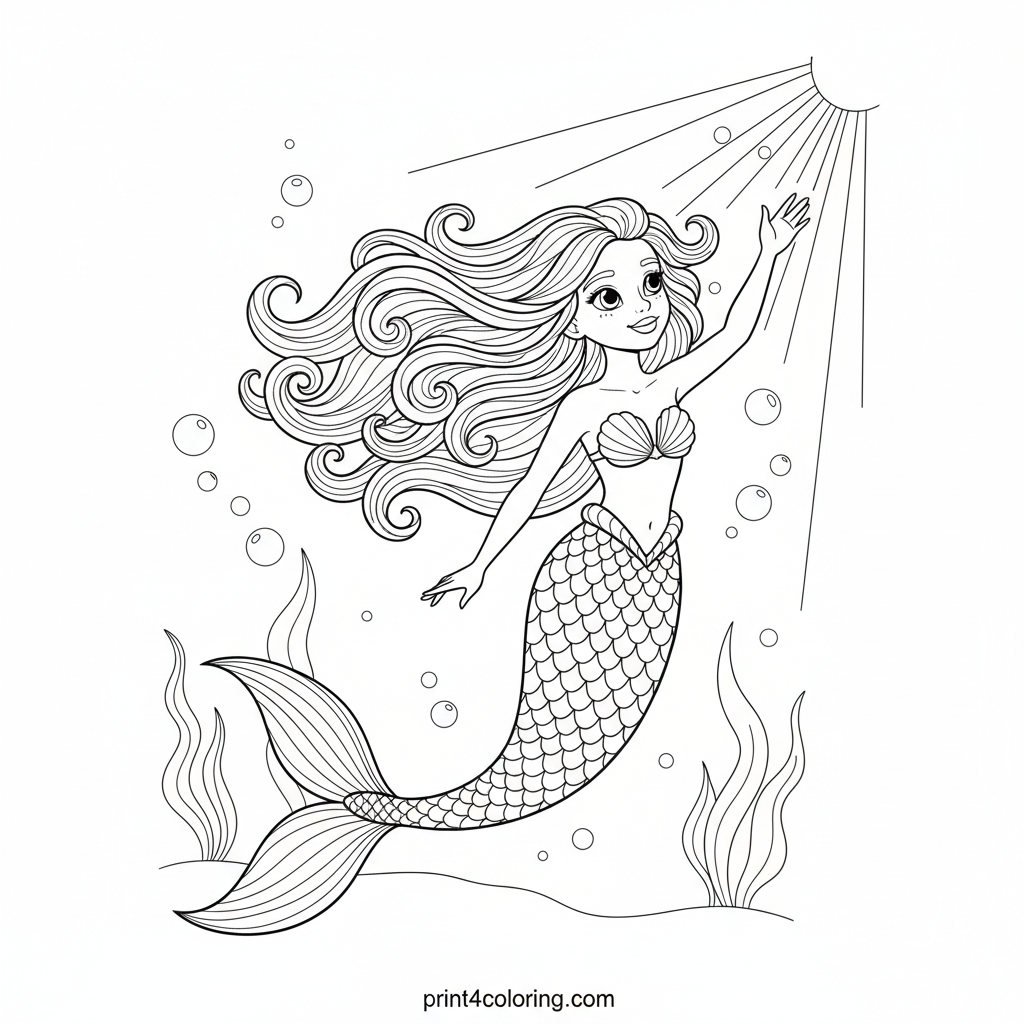 Dive into an enchanting underwater world! A stunning mermaid with flowing hair and a shimmering tail gracefully dances through crystal-clear ocean waters. She reaches for a magical sunbeam, surrounded by delicate bubbles and swaying seaweed. Bring this majestic ocean ballet to life with your most vibrant colors!