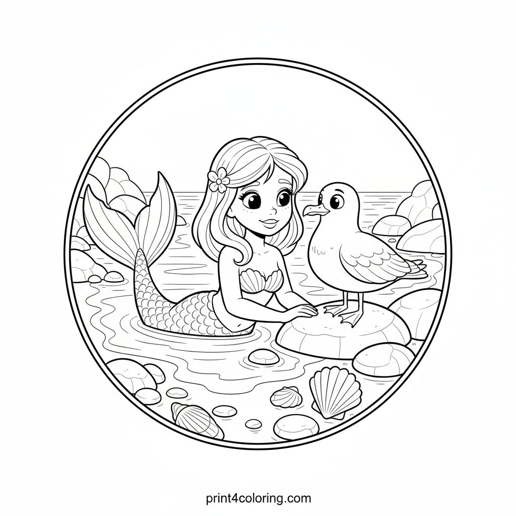 Dive into a magical scene where a friendly mermaid shares a secret smile with a curious seagull on a hidden, rocky beach. Her beautiful tail peeks from the gentle waves, surrounded by detailed seashells and smooth pebbles. Imagine the whispers of the ocean in this cozy, enchanting moment.