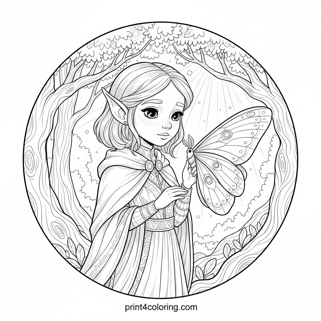 Step into a magical moonlit forest where a gentle elf, with exquisite attire, gazes thoughtfully at a magnificent, softly glowing moth. Delicate moonlight filters through ancient, gnarled trees, casting enchanting shadows. This serene scene invites you to add vibrant colors to its intricate details and bring the night's magic to life.