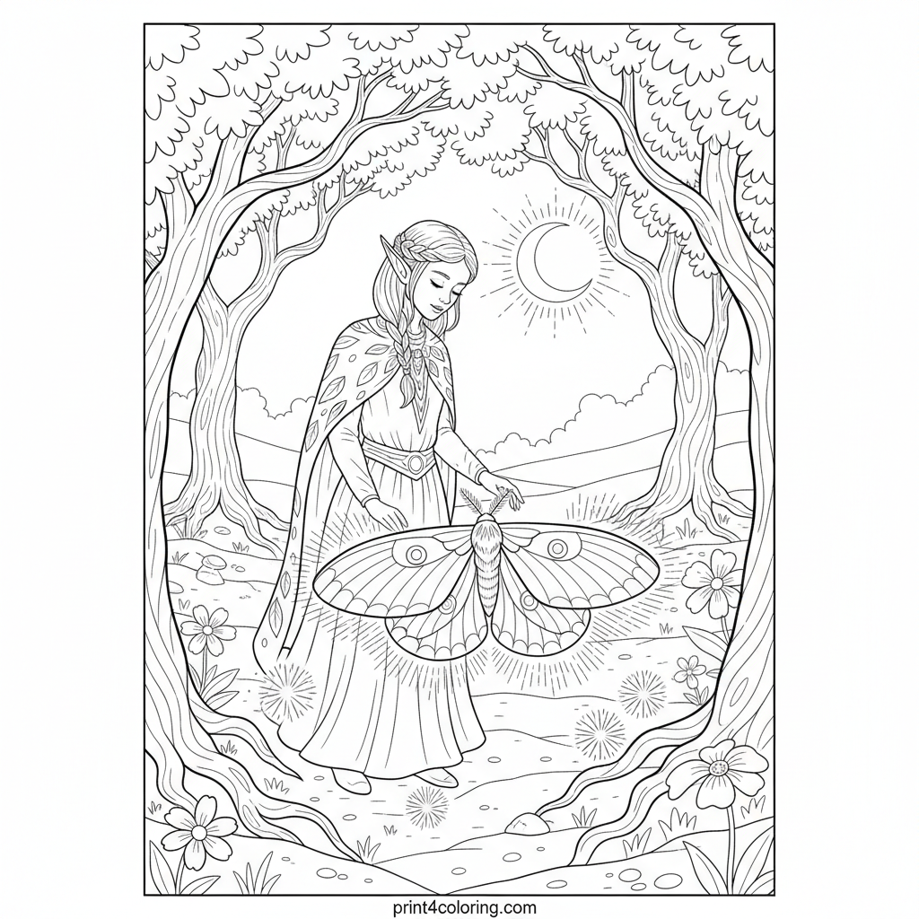 Step into a magical moonlit forest where a serene elf with intricate clothing gazes upon a magnificent moth. Its wings glow softly, illuminated by the gentle moonlight filtering through ancient trees. This enchanting scene invites you to add vibrant colors to a world of wonder and quiet magic.