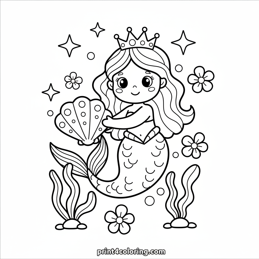 Dive into an enchanting underwater world with a beautiful mermaid! She's gently touching a glowing seashell that makes her magical sea garden sparkle. Friendly seaweed and colorful flowers twinkle all around. This delightful scene is perfect for young children ages 3-7 to color and imagine their own ocean adventure.