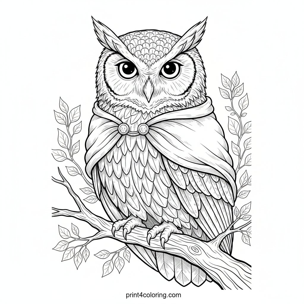 Step into a magical twilight world with this wise and friendly noble night owl! Perched on a sturdy branch, adorned in a flowing velvet cape, this detailed portrait invites you to bring its feathers, intricate leaves, and soft evening sky to life with your most vibrant colors. A true masterpiece awaits your artistic touch.