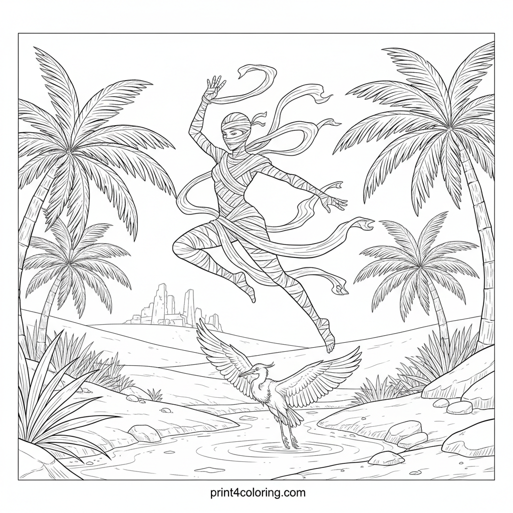 Discover a majestic, bandaged guardian figure standing serenely by a vibrant desert oasis. With intricate patterns on its wraps, it watches a desert bird drink from clear waters. Ancient ruins hint at stories untold in the distance. A detailed scene perfect for expert colorists!