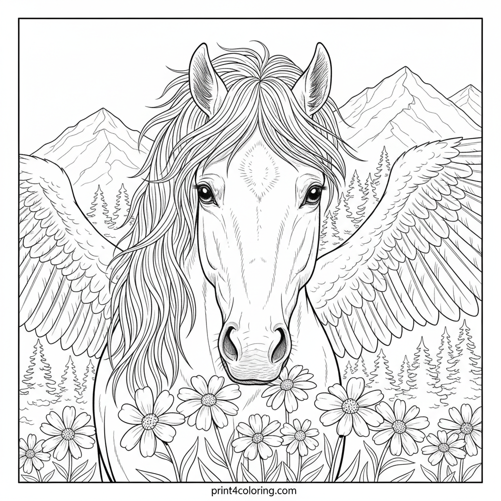 Meet a majestic pegasus in a close-up portrait, peacefully grazing on vibrant wildflowers in a sun-dappled alpine meadow. Its finely detailed feathery wings, flowing mane, and tail are ready for your colors. Realistic mountain peaks, with rocky formations and pine trees, complete this enchanting scene, inviting your artistic touch.