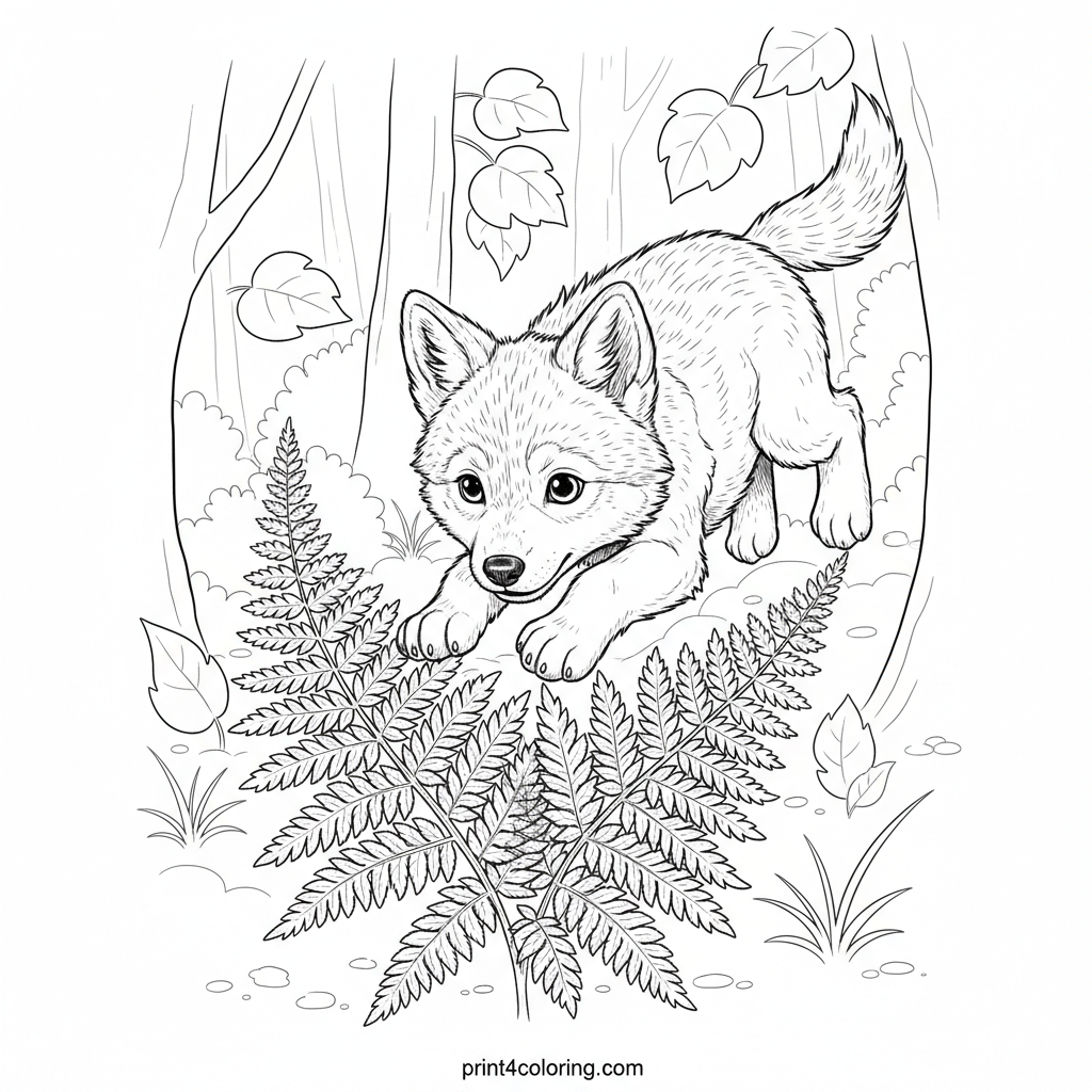 Join an adorable wolf pup in a sun-dappled forest clearing as it playfully pounces on a large, intricately detailed fern. With fluffy fur and big, curious eyes, this friendly pup invites you to bring its woodland adventure to life with your favorite colors. Explore the textures of fur and foliage in this charming scene.