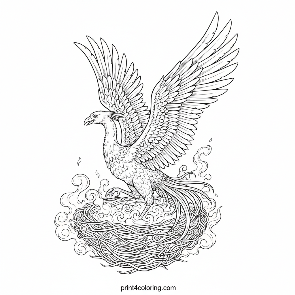 #phoenix#mythical creature#fantasy#bird#fire bird#nest#glowing embers#detailed#legendary#coloring-page#printable