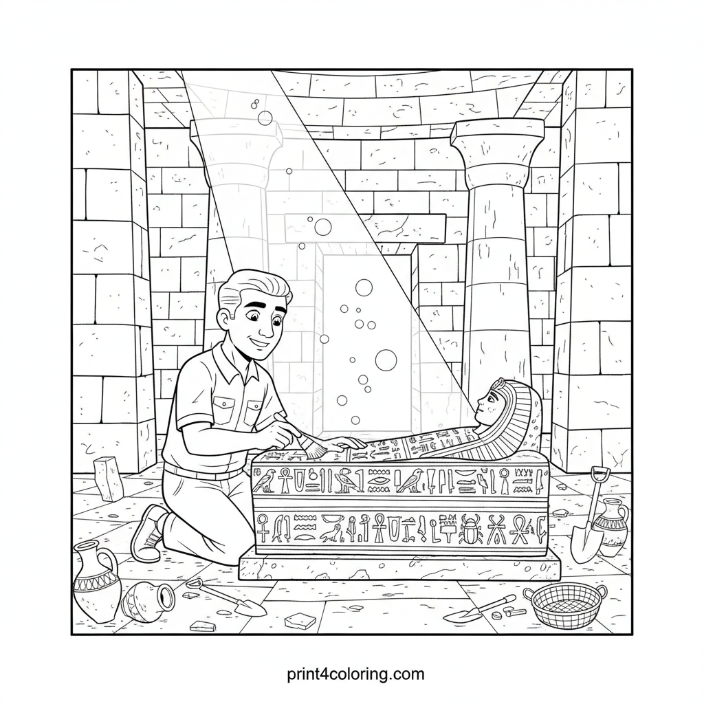 Journey deep into an ancient Egyptian tomb where a kind archaeologist carefully uncovers a magnificent sarcophagus. Intricate hieroglyphs tell tales of old, while sunlight peeks through, revealing hidden treasures and dust motes dancing in the air. A grand scene waiting for your expert colors!
