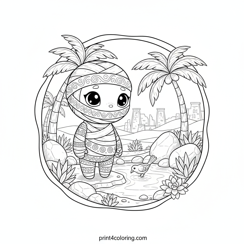 Discover a cozy desert sanctuary with the Gentle Oasis Guardian. This majestic, bandaged figure, adorned with intricate patterns, watches peacefully over a lush oasis with palm trees and clear water. A desert bird sips nearby, while ancient ruins hint at forgotten tales. A serene scene for imaginative coloring!