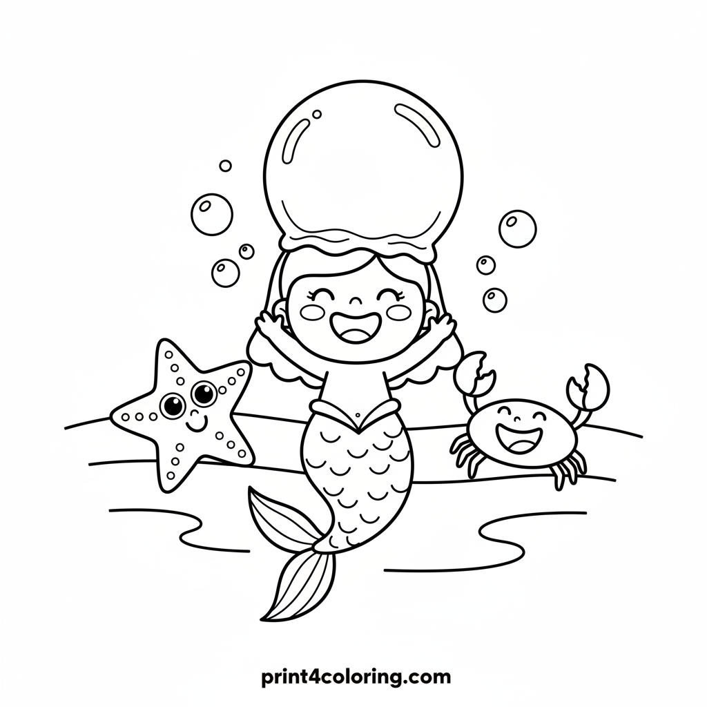 Dive into an ocean of fun with our silly mermaid! She's wearing a giant, wobbly bubble as a hat, making her starfish and crab friends giggle. This charming coloring page is perfect for young children ages 3-7, encouraging creativity and smiles with its simple, delightful scene.