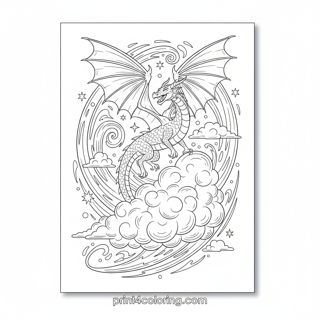 Soar through the skies with a magnificent, sleek dragon, its powerful wings propelling it across a vast, puffy cloud. Feel the rush of the wind as it swirls around its happy face, creating a scene of pure aerial delight. A fantastic adventure awaits your colors!