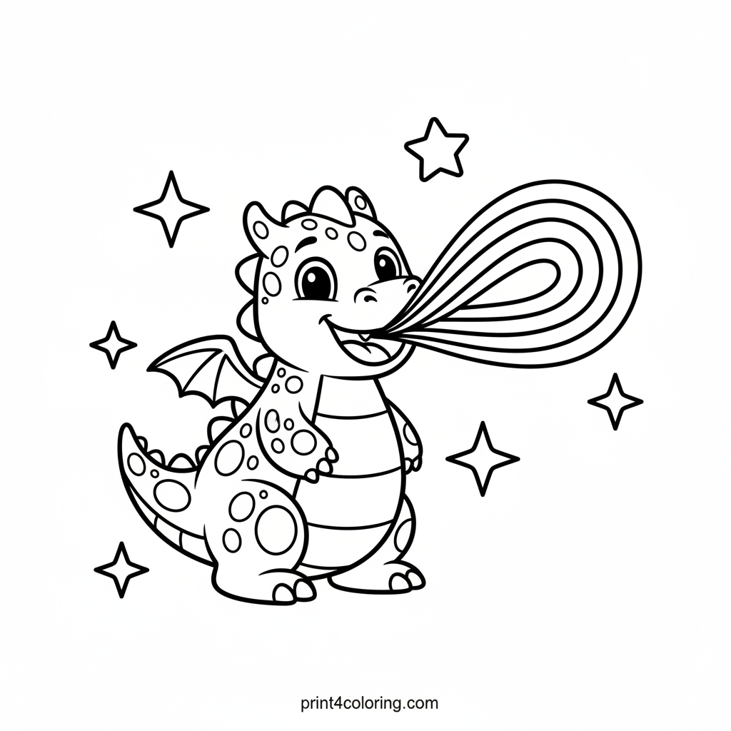 Meet a gentle, smiling sparkle dragon creating a beautiful rainbow! This magical scene shows our friendly dragon exhaling a vibrant arc across the sky, with tiny stars and sparkles. Perfect for young children ages 3-7, this easy coloring page offers a delightful fantasy adventure for little artists.