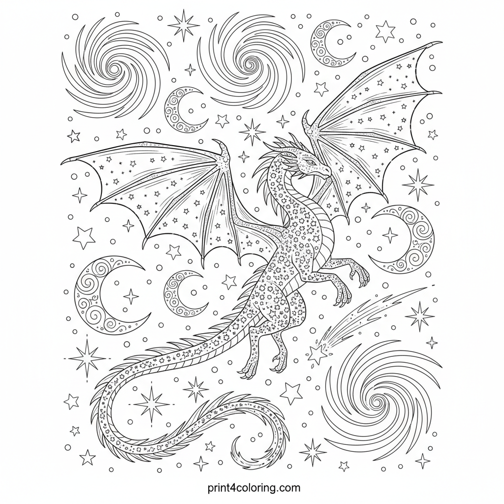 Embark on an epic coloring adventure with a magnificent starlight dragon, its scales shimmering with cosmic dust. Soar through a breathtaking night sky, past twinkling stars, radiant crescent moons, and mesmerizing swirling galaxies, bringing this celestial guardian to life with your vibrant imagination.