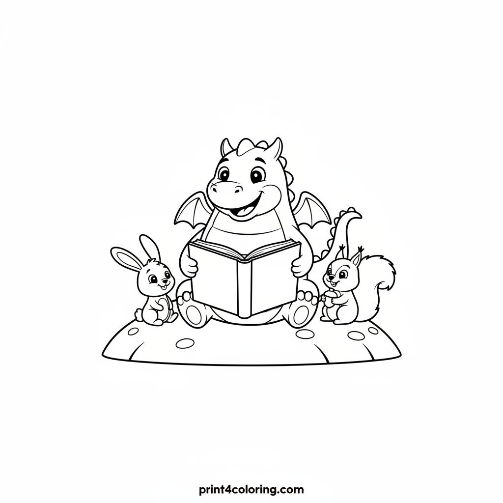 Snuggle up for a magical storytime! A kind, big-bellied dragon reads a big picture book to his attentive forest friends, a bunny and a squirrel, on a soft hill. This heartwarming scene is perfect for young children ages 3-7 to color, sparking imagination and a love for books.