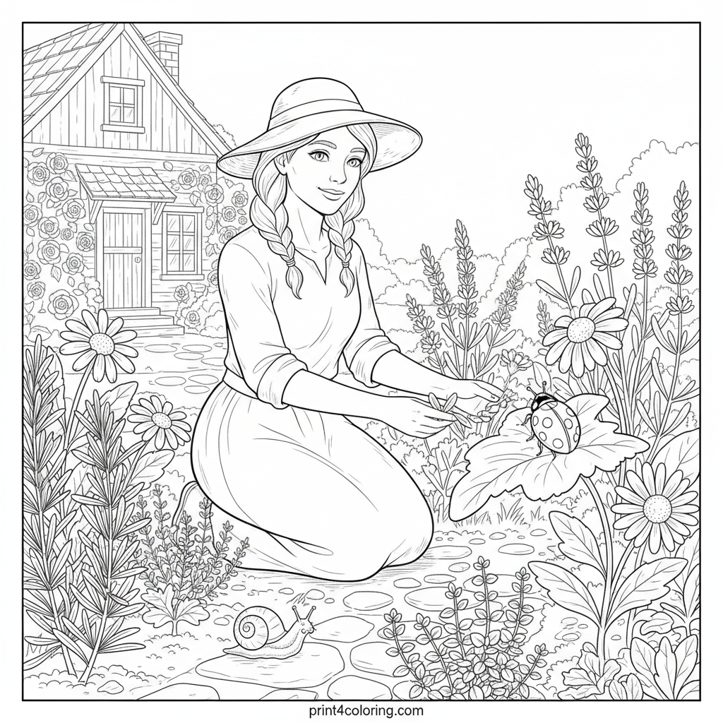 Step into a serene world where a kind botanical witch tends her lush herb garden. Discover rosemary, lavender, thyme, and chamomile drawn with exquisite detail. A friendly ladybug and a tiny snail share the path as a rustic cottage with climbing roses peeks from the background. A delightful scene for detailed coloring.