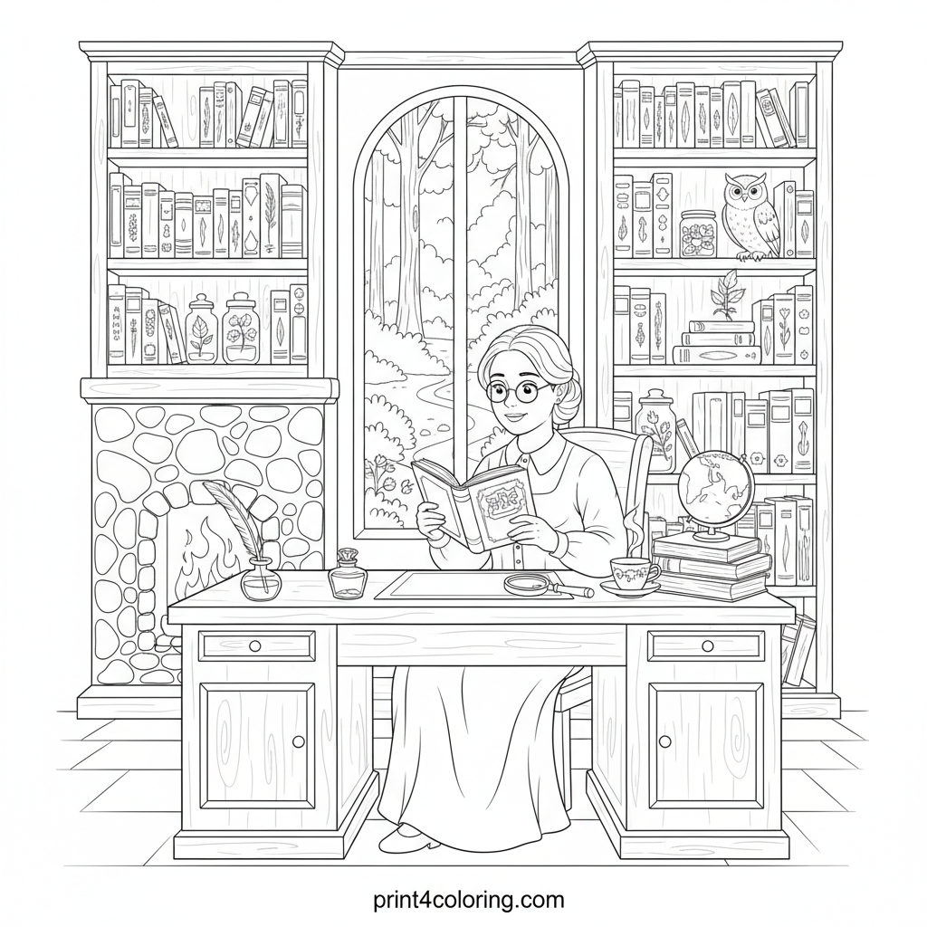 The Cozy Witch's Enchanted Study Nook Coloring Page