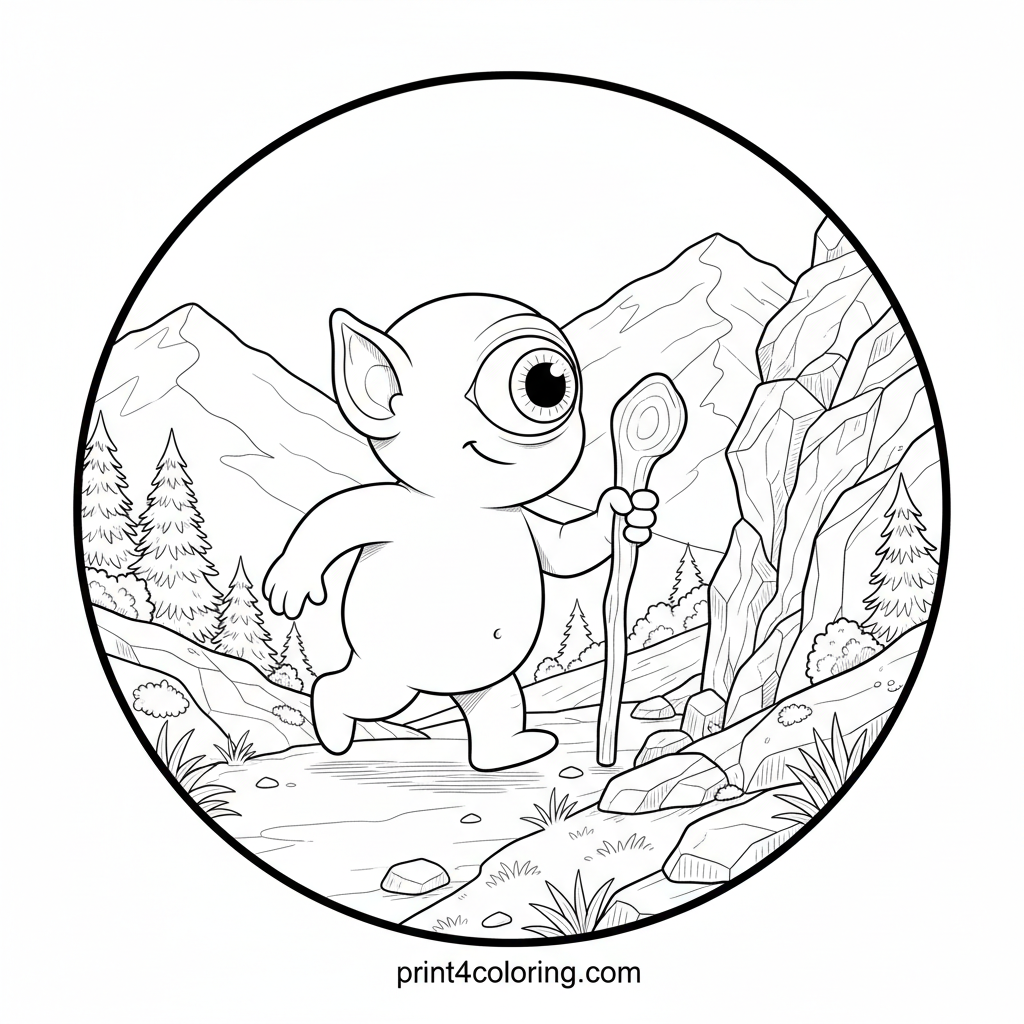 Join a friendly cyclops with a single, curious eye on an exciting mountain adventure! Watch as it carefully navigates a winding trail, perhaps holding a walking stick or examining a detailed rock. The scene features realistic pines and moss, with distant peaks, inviting you to color a world of discovery.