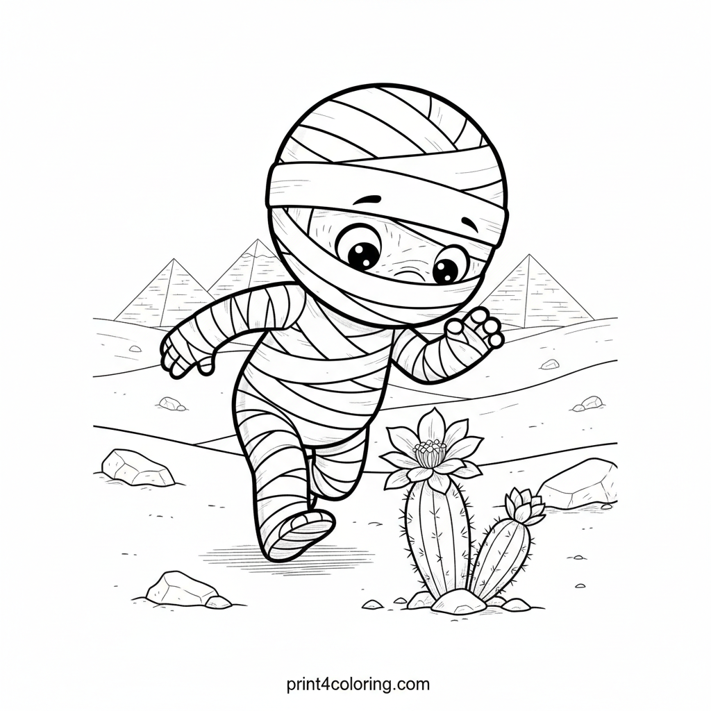 Join our adorable little mummy, with big friendly eyes peeking from clean bandages, on an exciting desert adventure! It's curiously discovering a beautiful desert flower, set against a backdrop of majestic pyramids and a bright blue sky. A wonderful scene to bring to life with your favorite colors!