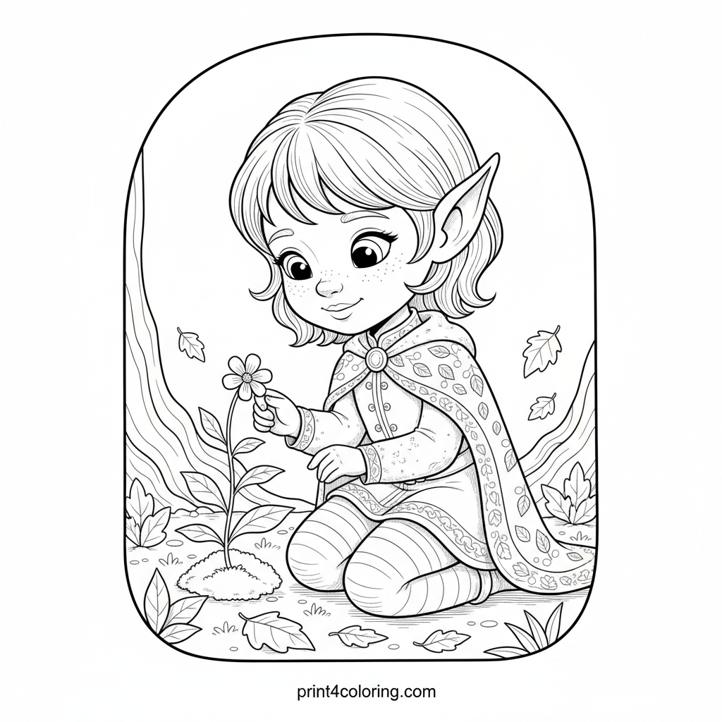 Join a kind-hearted young forest elf as they gently discover a tiny, delicate wildflower hidden among moss. This enchanting scene captures the magic of the forest floor, with intricate roots and fallen leaves creating a cozy backdrop. Bring this beautiful moment to life with your favorite colors, imagining nature's quiet wonders.
