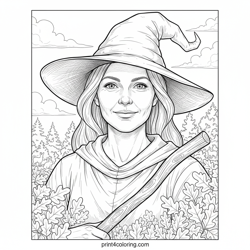 Soar above a wondrous forest with a graceful witch on her sturdy broomstick! This intricate scene features a serene woman in flowing robes, surrounded by detailed oak, pine, and birch trees. Look closely for deer and rabbits peeking from the foliage, all under a vast, clear sky with soft clouds.