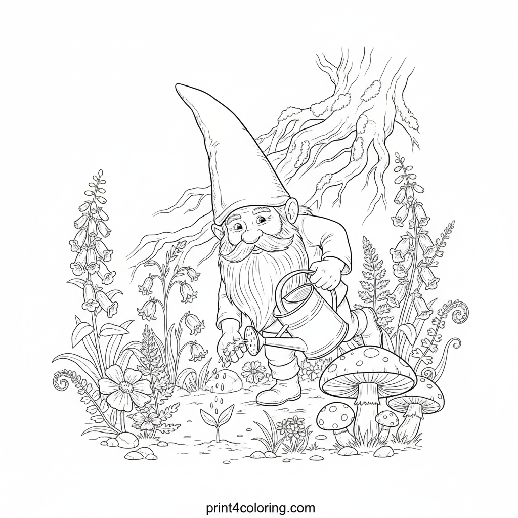 #gnome#secret garden#wildflowers#toadstools#fantasy#nature#watering can#magical#detailed#coloring-page#printable