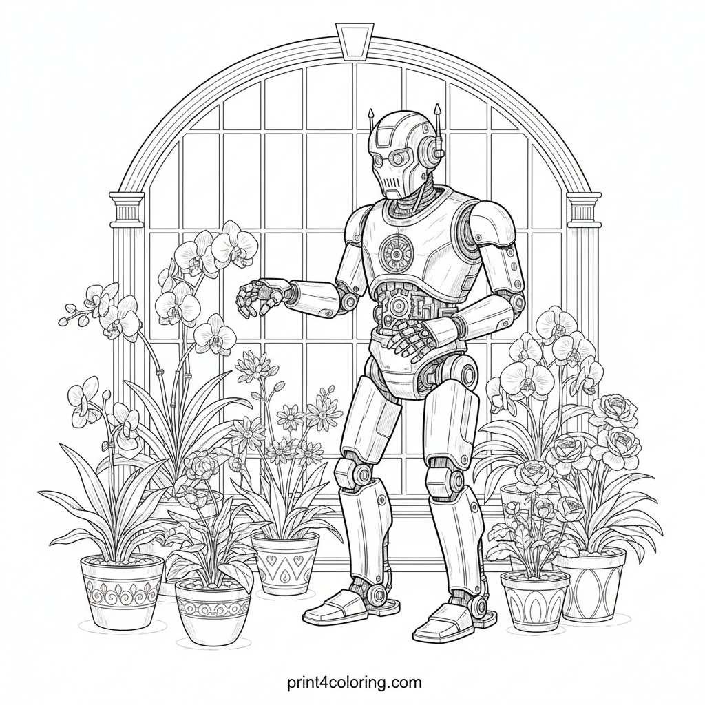 Explore a grand greenhouse where a magnificent botanical gardener robot meticulously tends vibrant potted plants and exquisite orchids. Its articulated arms and visible gears create an intricate, futuristic scene. Bring this detailed world where technology meets nature to life with your expert coloring.