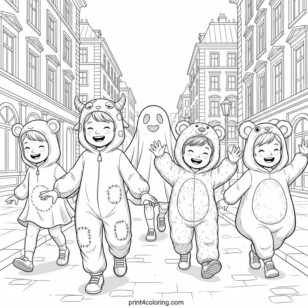 #costume parade#city scene#children#monsters#halloween fun#community event#detailed#coloring-page#printable