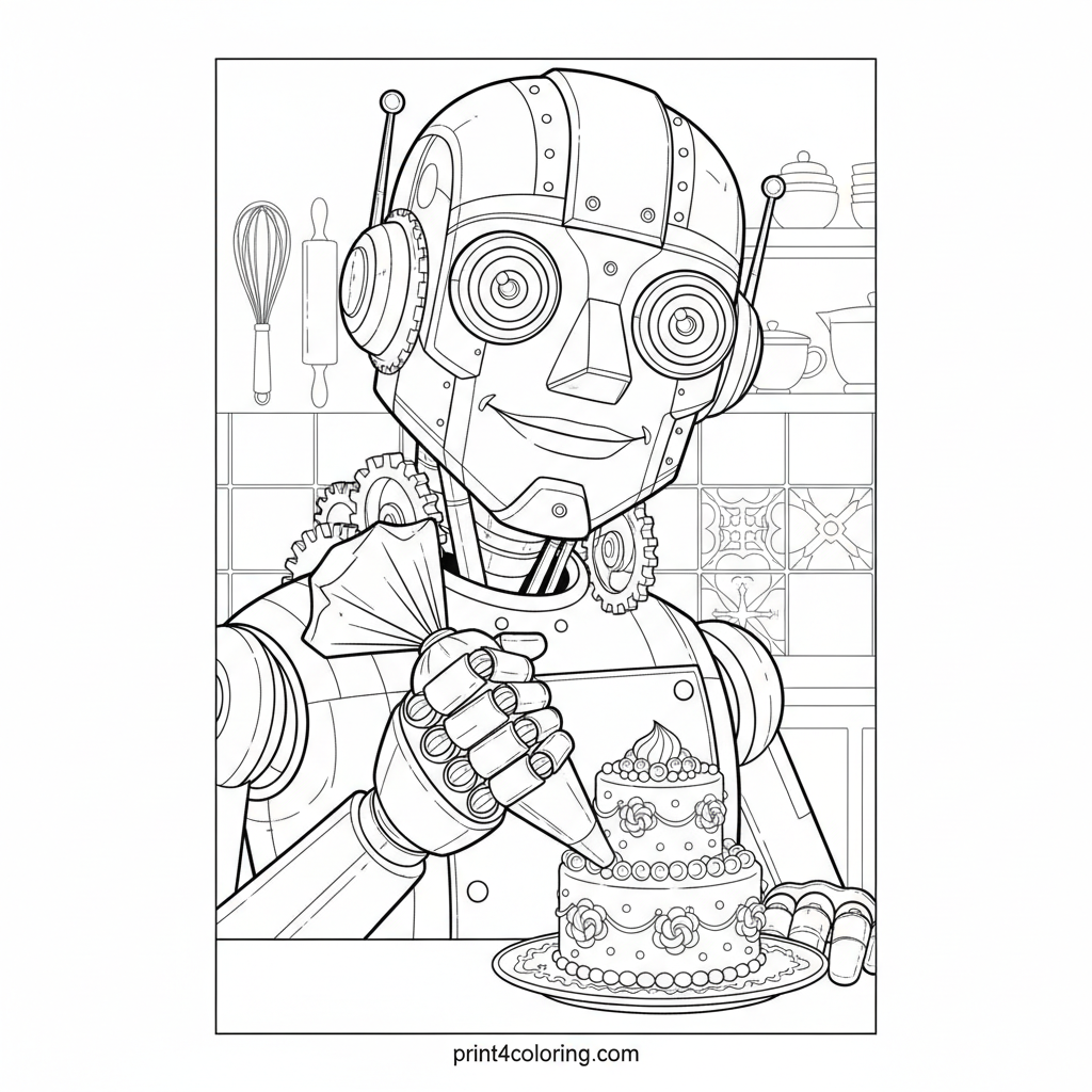Step into a charming, old-fashioned kitchen where a magnificent clockwork robot, with gleaming brass and intricate gears, is meticulously decorating a towering tiered cake! Observe its expressive optical sensors as it adds the final sweet touches amidst antique utensils and beautifully patterned tiles. A delightful scene for aspiring bakers and robot enthusiasts!