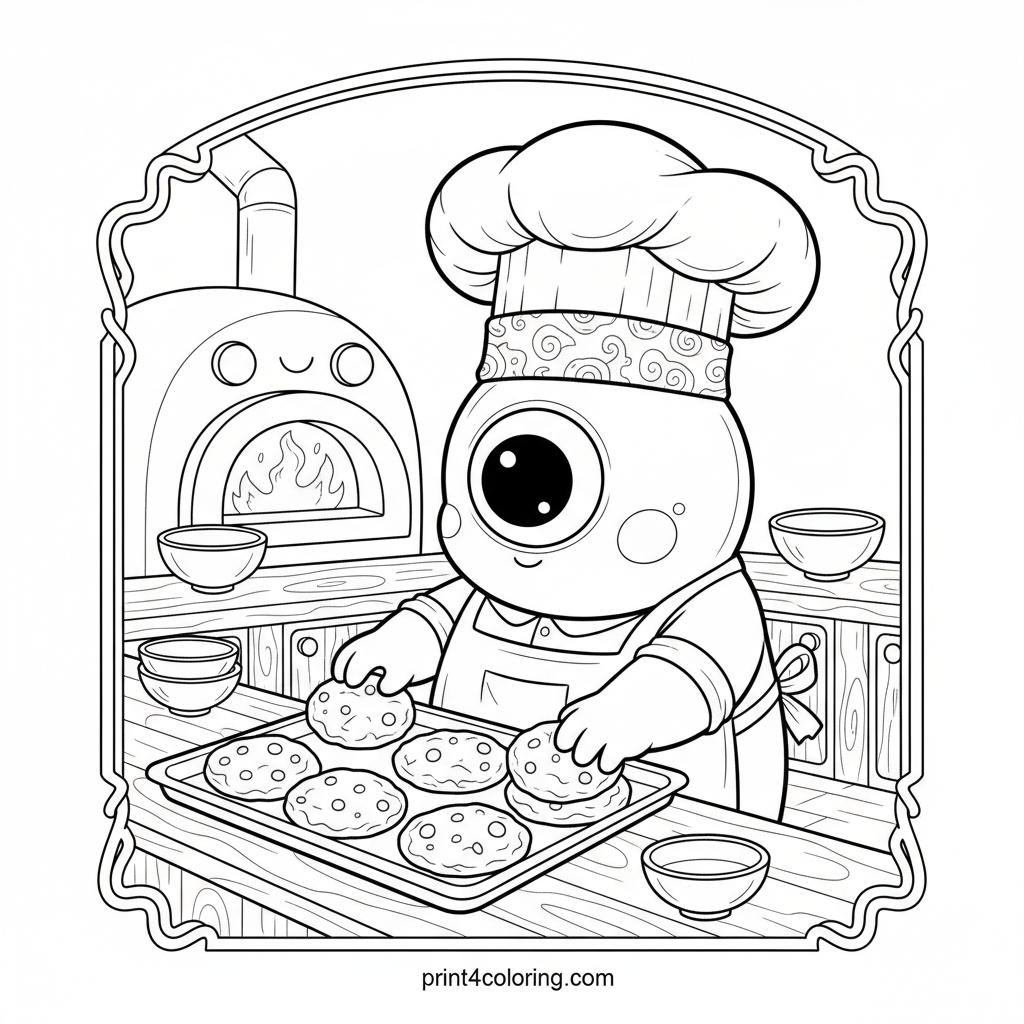 Join our adorable cyclops chef, flour-dusted and focused, as they meticulously bake a batch of enormous, delicious cookies! This cozy kitchen scene features rustic details, mixing bowls, and a giant oven, inviting you to add vibrant colors to this heartwarming culinary adventure. Perfect for aspiring bakers and fantasy fans!