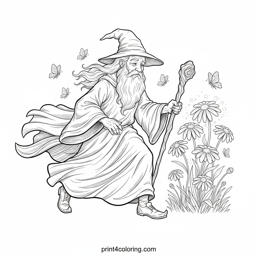 Step into an enchanted meadow where a kind-faced wizard with a flowing robe and sturdy staff gently points towards glowing wildflowers. Realistic butterflies and tiny insects flutter around, creating a magical and lively scene. Bring this wondrous moment to life with your favorite colors, imagining the soft light and gentle magic.