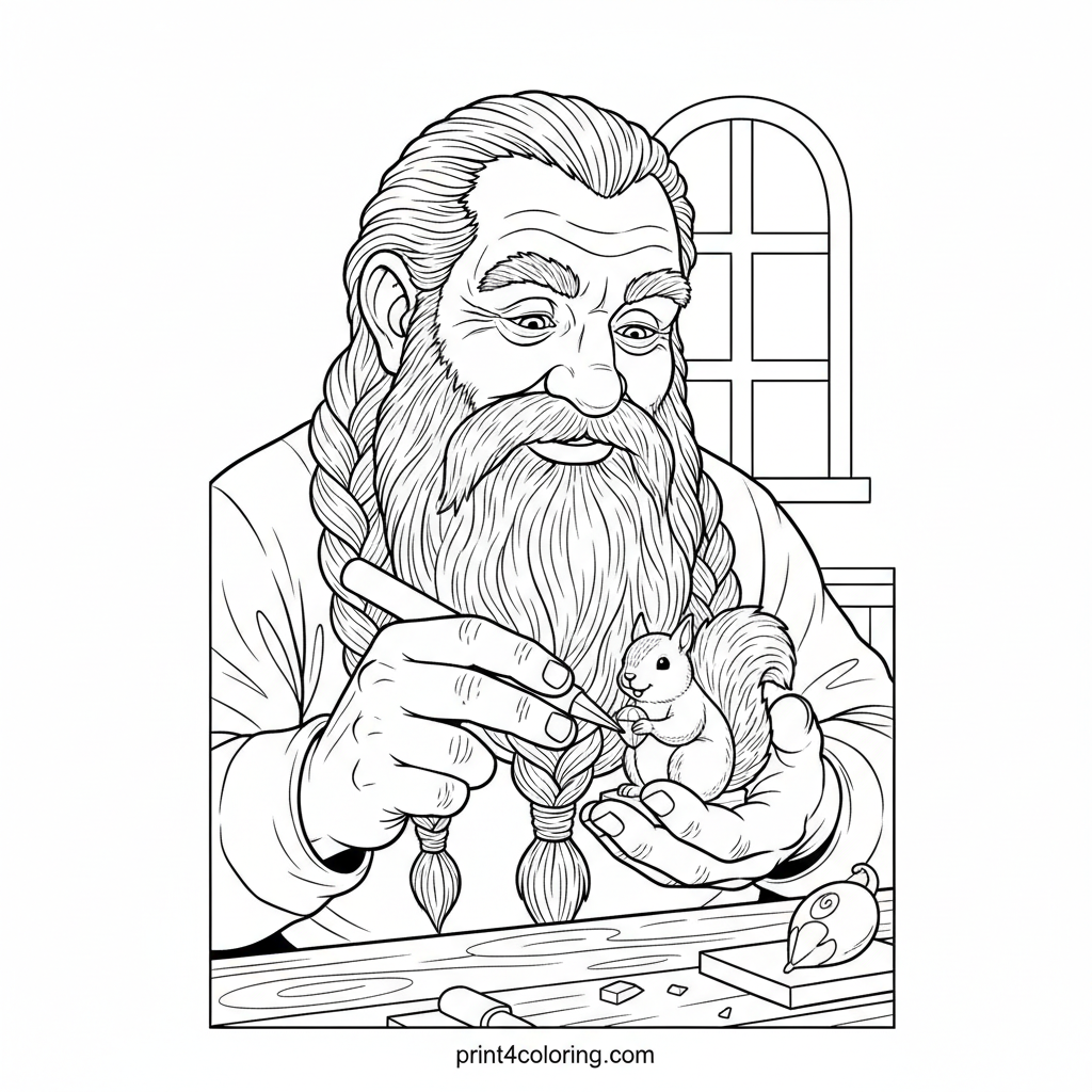 Step into the magical world of a wise dwarf master sculptor! Watch as he carefully carves a tiny forest animal, surrounded by intricate tools and beautiful finished artworks. Sunlight streams into his cozy wooden workshop, highlighting every detail of his craft. A perfect scene for coloring all the textures and treasures!