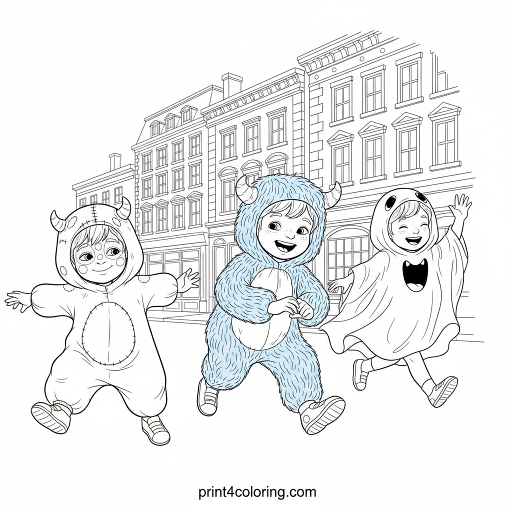 Join a joyful parade of children in their most creative, homemade monster costumes! Watch a sleepy green monster shuffle past, while friendly ghosts and fuzzy creatures wave against a backdrop of grand city buildings. This lively scene invites you to bring a burst of color to their festive celebration, capturing every detail of their imaginative outfits and the bustling urban setting.