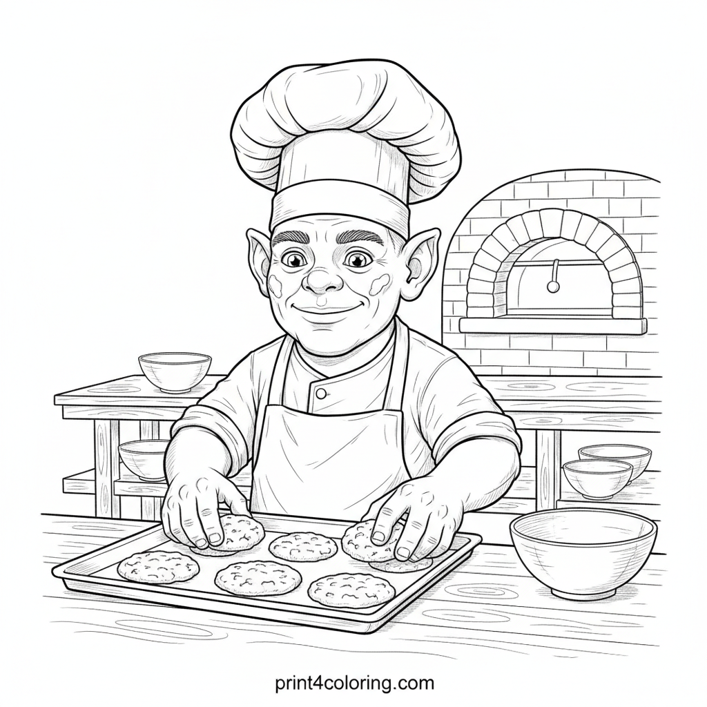 Step into a magical kitchen where a friendly cyclops chef is baking enormous, delicious cookies! With a flour-dusted cheek and focused single eye, this delightful baker carefully places treats onto a baking sheet. Explore a cozy scene filled with rustic counters, mixing bowls, and a grand oven, perfect for a heartwarming coloring adventure.