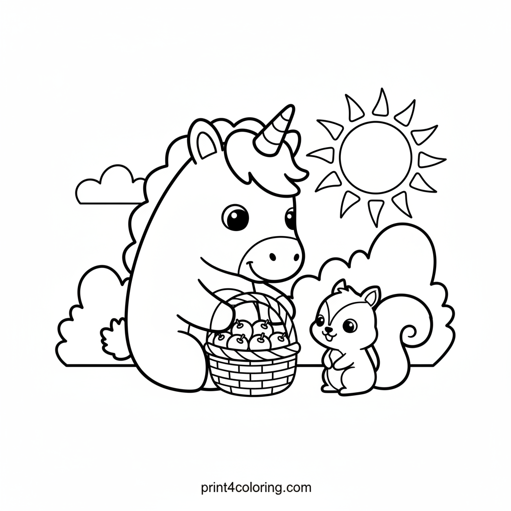 Dive into a magical scene where a gentle unicorn shares a basket of yummy berries with a tiny, friendly squirrel. This heartwarming coloring page is perfect for young children ages 3-7, encouraging creativity and kindness. Grab your crayons and bring this sweet moment to life with your favorite colors!
