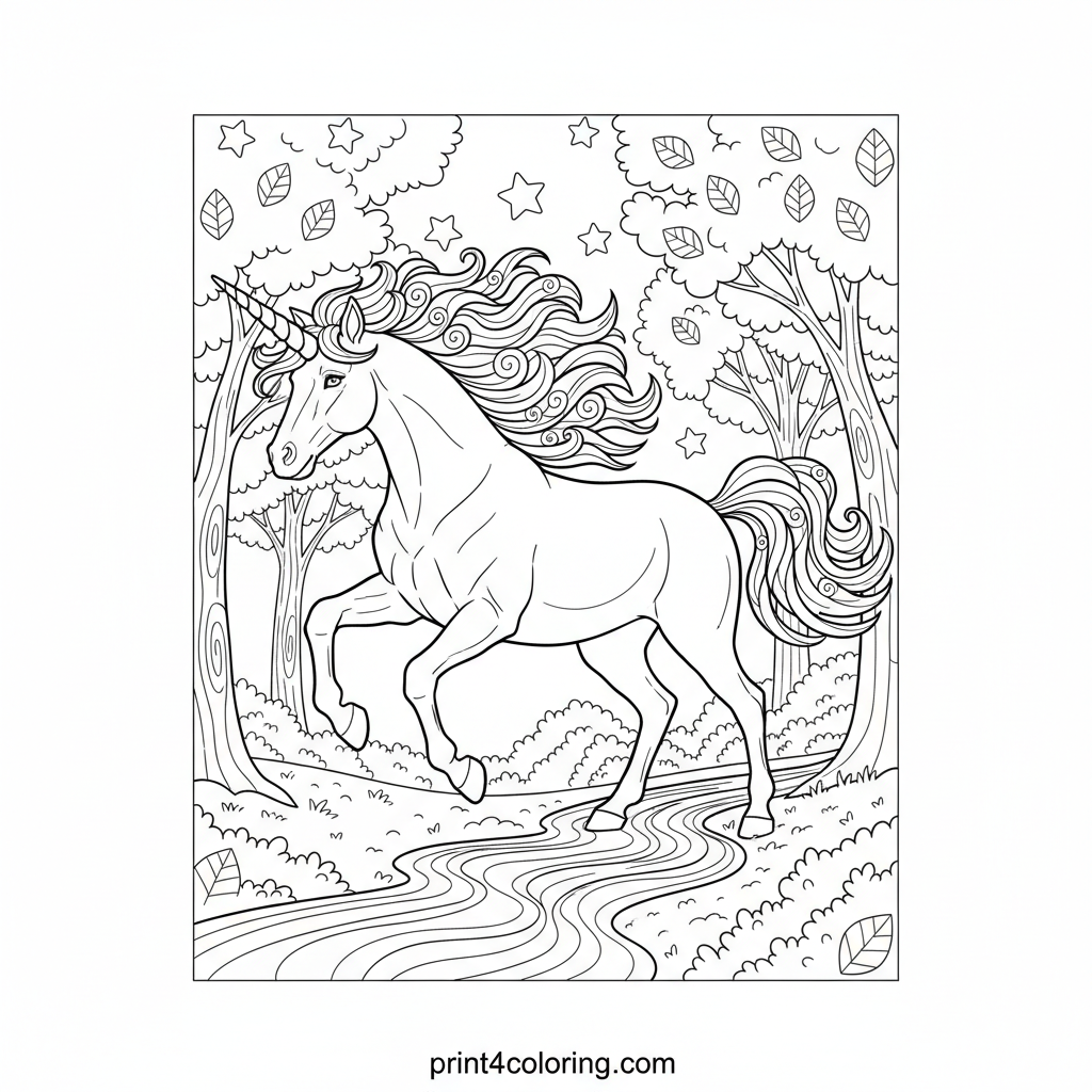 Imagine the magic! A majestic unicorn soars through a mystical starlit forest, its flowing mane and tail catching the light as it leaps over a shimmering magical stream. This enchanting scene is perfect for children ages 8-12 who love fantasy and mythical creatures. Bring this powerful unicorn to life with your most vibrant colors!