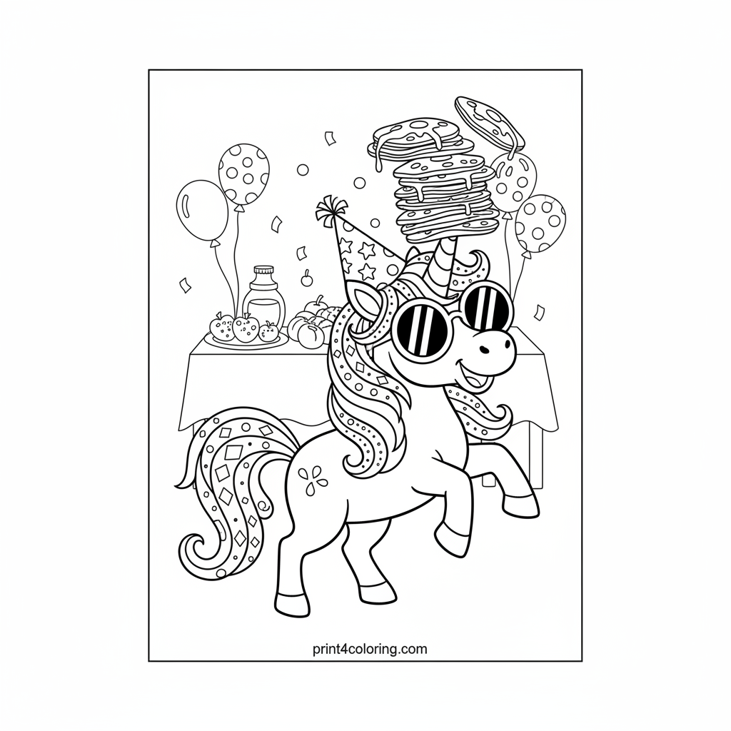 Join a mischievous unicorn on its prank day! Wearing oversized sunglasses and a silly party hat, this unicorn is playfully trying to balance a stack of colorful, wobbly pancakes on its horn. It's a clumsy but happy scene, perfect for children ages 8-12 to color and enjoy.