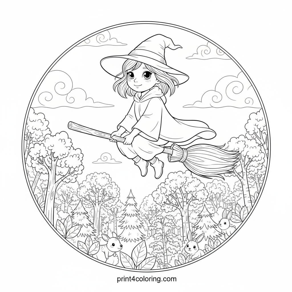 Whimsical Forest Witch's Gentle Flight Coloring Page